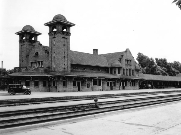 Designed by the Detroit architectural firm of Spier and Rohns, the Grand Trunk Depot is an interesting mix of architectural styles. The outer building has many Dutch features, including battlements and parapet walls (low, protective wall along the edge of the roof with indentations for defense). The gutters were designed to look like cannons extending from the parapet walls. The roof of the depot has strong Spanish influence, being covered in 1,200 red ceramic roof tiles. The depot’s two towers originally stood as Hindu style domes, much like the ones on the backside of the building. And on the grounds of the depot were many beautiful floral gardens, maintained by Olaf Jensen until his retirement in 1954.
